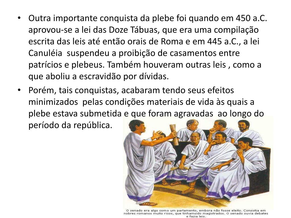 Outra importante conquista da plebe foi quando em 450 a.C. aprovou-se a lei das Doze Tábuas, que era uma compilação escrita das leis até então orais de Roma e em 445 a.C., a lei Canuléia suspendeu a proibição de casamentos entre patrícios e plebeus. Também houveram outras leis , como a que aboliu a escravidão por dívidas. • Porém, tais conquistas, acabaram tendo seus efeitos minimizados pelas condições materiais de vida às quais a plebe estava submetida e que foram agravadas ao longo do período da república.