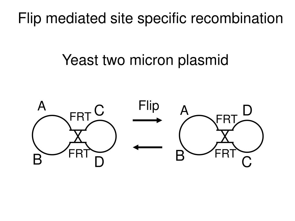 Flip mediated site specific recombination Yeast two micron plasmid Flip A C D A FRT FRT FRT B FRT B D C
