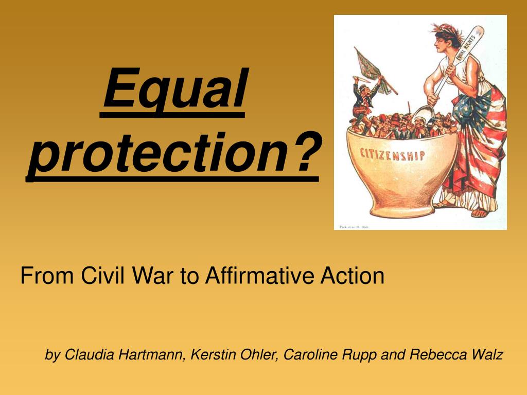 Equal protection?. From Civil War to Affirmative Action by Claudia Hartmann, Kerstin Ohler, Caroline Rupp and Rebecca Walz. Equal Protection. Background:. part of the 14 th Amendment to the United States Constitution. enacted in 1868 , shortly after the American Civil War.