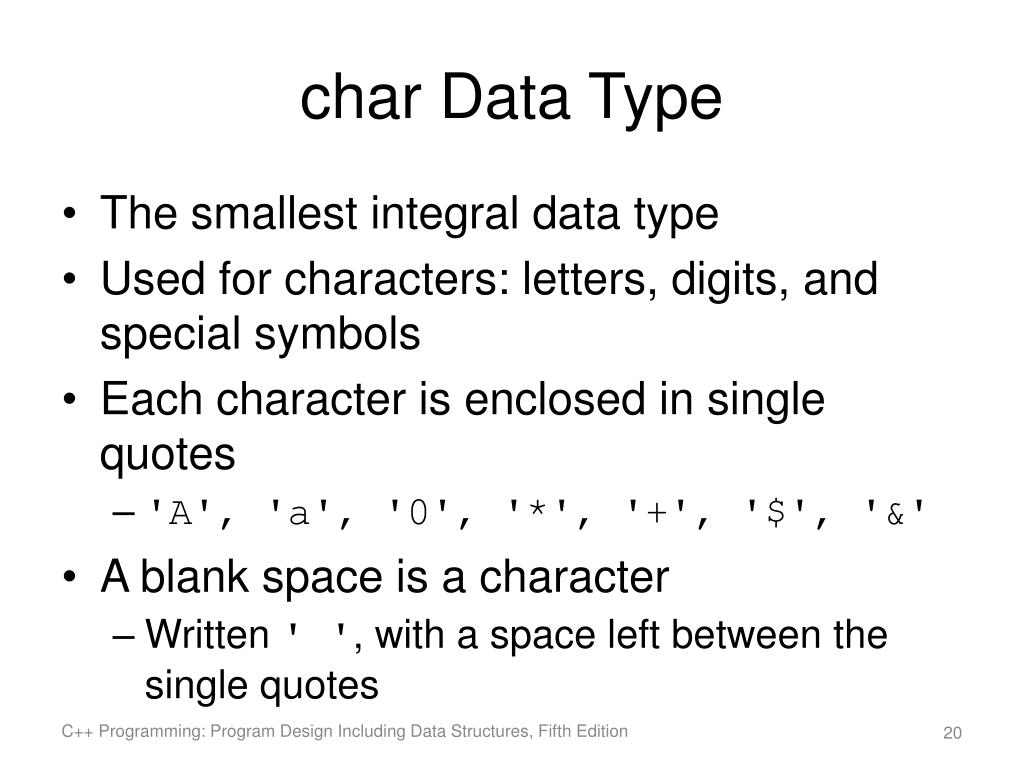 char Data Type • The smallest integral data type • Used for characters: letters, digits, and special symbols • Each character is enclosed in single quotes • 'A', 'a', '0', '*', '+', '$', '&' • A blank space is a character • Written ' ', with a space left between the single quotes C++ Programming: Program Design Including Data Structures, Fifth Edition