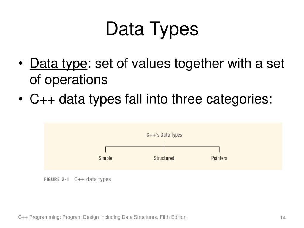 Data Types • Data type: set of values together with a set of operations • C++ data types fall into three categories: C++ Programming: Program Design Including Data Structures, Fifth Edition