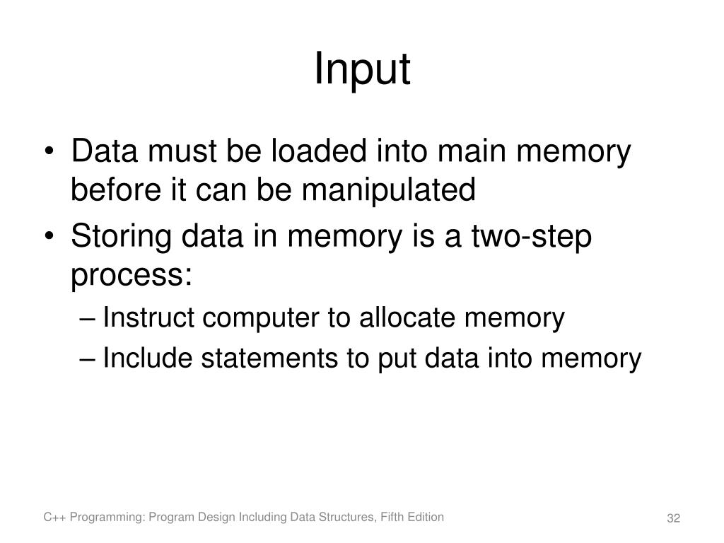 Input • Data must be loaded into main memory before it can be manipulated • Storing data in memory is a two-step process: • Instruct computer to allocate memory • Include statements to put data into memory C++ Programming: Program Design Including Data Structures, Fifth Edition