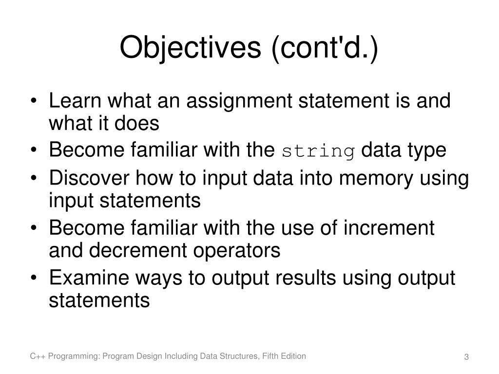 Objectives (cont'd.) • Learn what an assignment statement is and what it does • Become familiar with the string data type • Discover how to input data into memory using input statements • Become familiar with the use of increment and decrement operators • Examine ways to output results using output statements C++ Programming: Program Design Including Data Structures, Fifth Edition