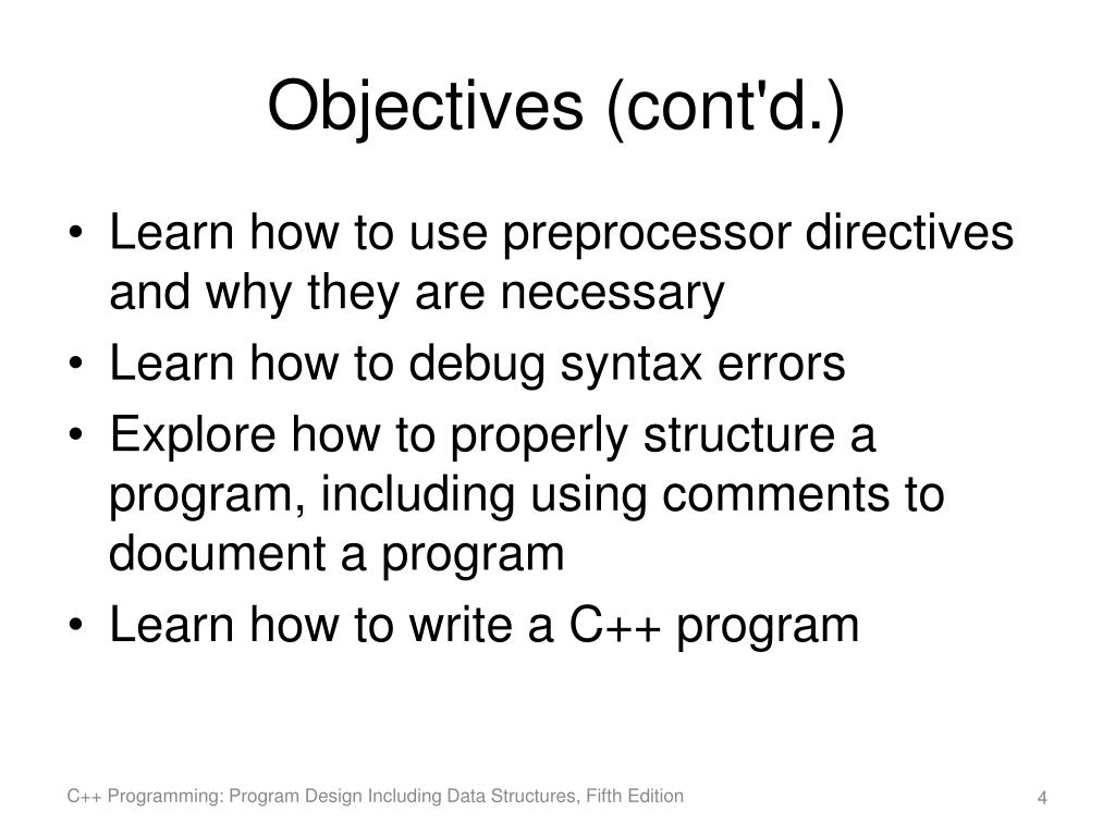Objectives (cont'd.) • Learn how to use preprocessor directives and why they are necessary • Learn how to debug syntax errors • Explore how to properly structure a program, including using comments to document a program • Learn how to write a C++ program C++ Programming: Program Design Including Data Structures, Fifth Edition