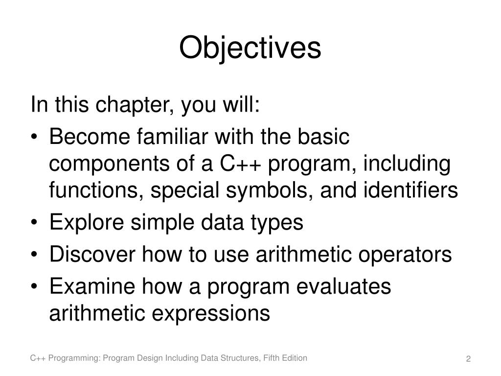 C++ Programming: Program Design Including Data Structures, Fifth Edition. Chapter 2: Basic Elements of C++. Objectives. In this chapter, you will: Become familiar with the basic components of a C++ program, including functions, special symbols, and identifiers Explore simple data types