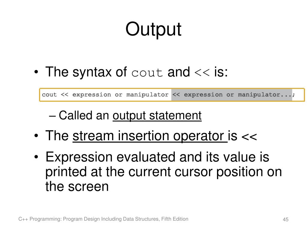 Output • The syntax of cout and << is: • Called an output statement • The stream insertion operator is << • Expression evaluated and its value is printed at the current cursor position on the screen C++ Programming: Program Design Including Data Structures, Fifth Edition