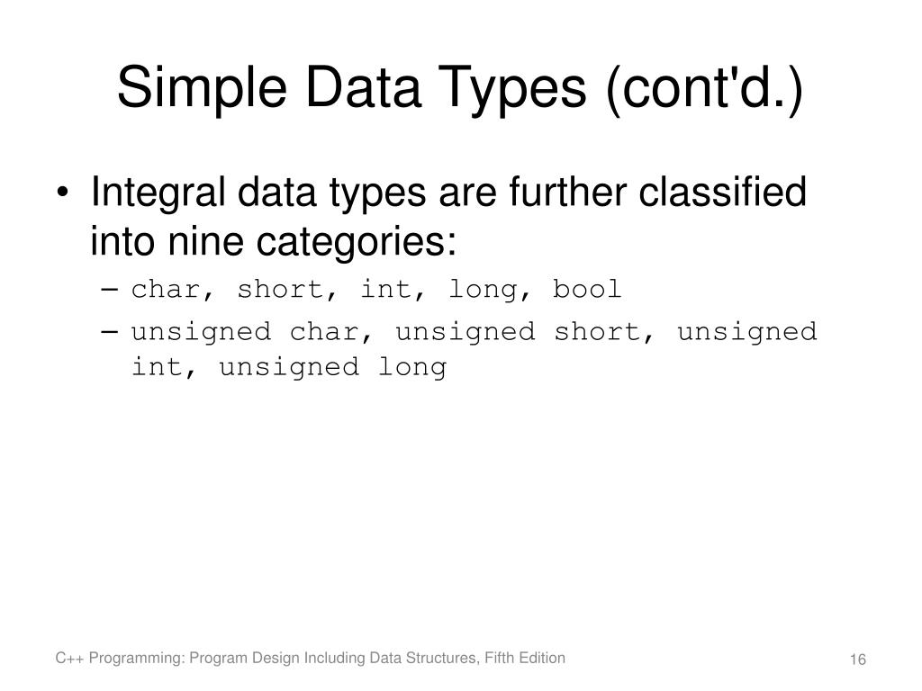 Simple Data Types (cont'd.) • Integral data types are further classified into nine categories: • char, short, int, long, bool • unsigned char, unsigned short, unsigned int, unsigned long C++ Programming: Program Design Including Data Structures, Fifth Edition
