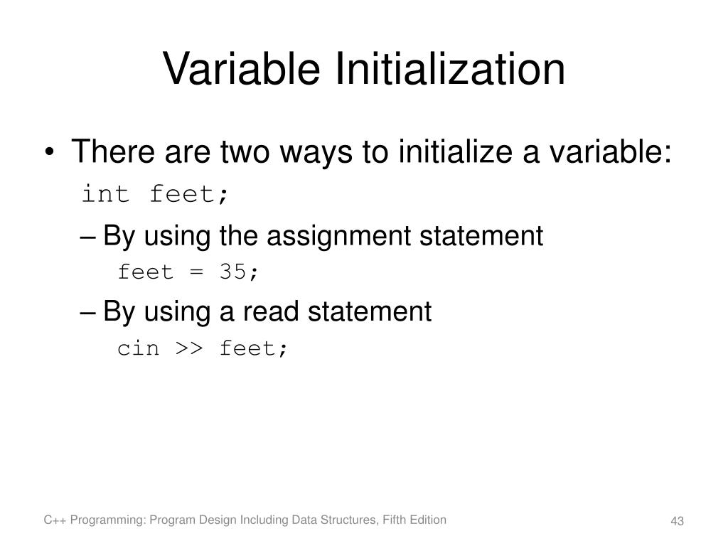 Variable Initialization • There are two ways to initialize a variable: int feet; • By using the assignment statement feet = 35; • By using a read statement cin >> feet; C++ Programming: Program Design Including Data Structures, Fifth Edition
