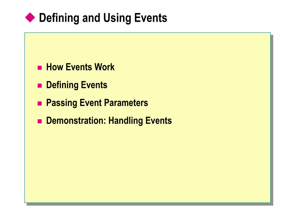 Defining and Using Events • How Events Work • Defining Events • Passing Event Parameters • Demonstration: Handling Events
