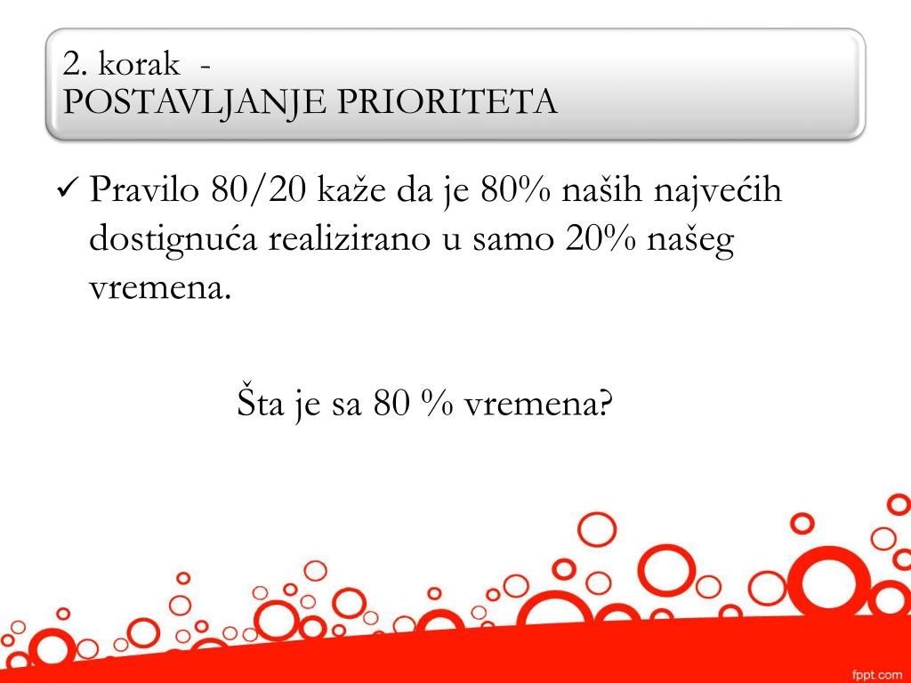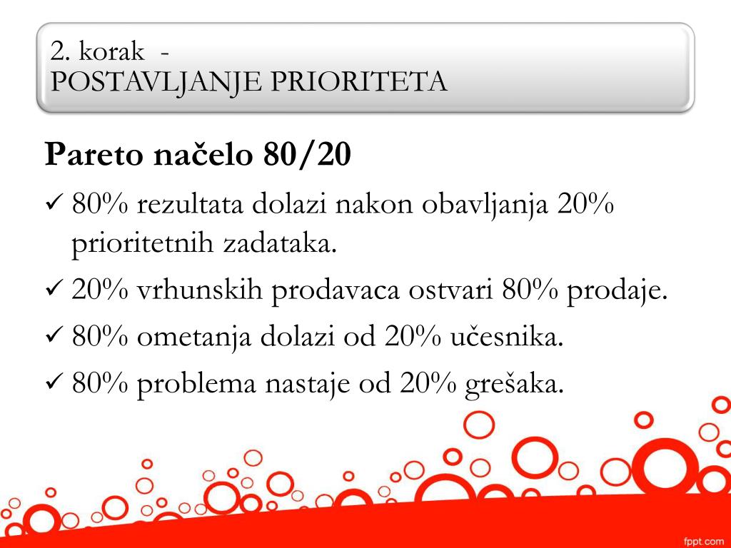 Pareto načelo 80/20 • 80% rezultata dolazi nakon obavljanja 20% prioritetnih zadataka. • 20% vrhunskih prodavaca ostvari 80% prodaje. • 80% ometanja dolazi od 20% učesnika. • 80% problema nastaje od 20% grešaka.