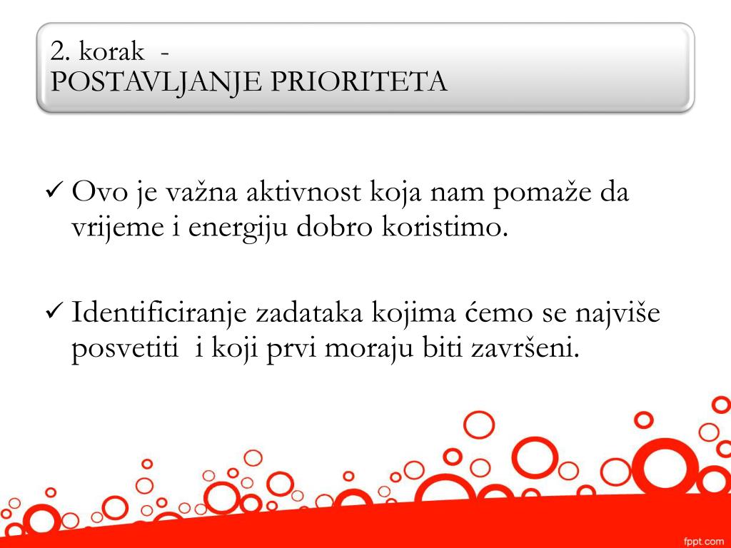 Ovo je važna aktivnost koja nam pomaže da vrijeme i energiju dobro koristimo. • Identificiranje zadataka kojima ćemo se najviše posvetiti i koji prvi moraju biti završeni.