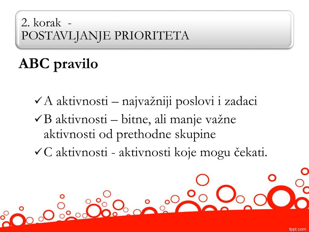 ABC pravilo • A aktivnosti – najvažniji poslovi i zadaci • B aktivnosti– bitne, ali manje važne aktivnosti od prethodne skupine • C aktivnosti - aktivnosti koje mogu čekati.
