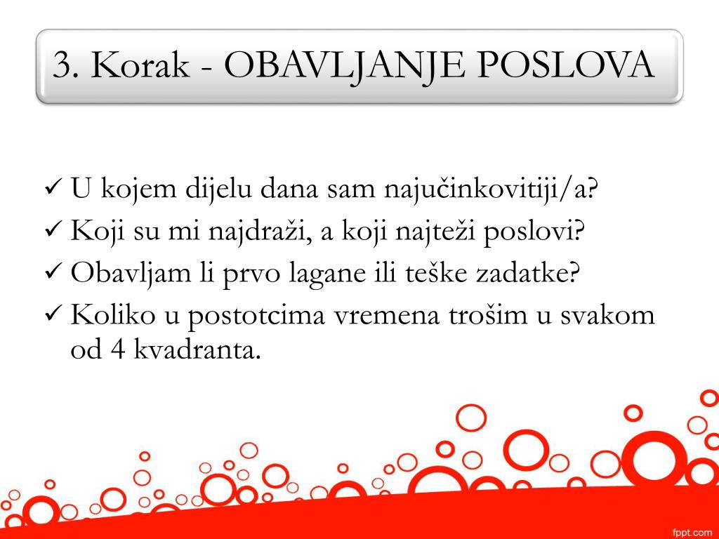 U kojem dijelu dana sam najučinkovitiji/a? • Koji su mi najdraži, a koji najteži poslovi? • Obavljam li prvo lagane ili teške zadatke? • Koliko u postotcima vremena trošim u svakom od 4 kvadranta.