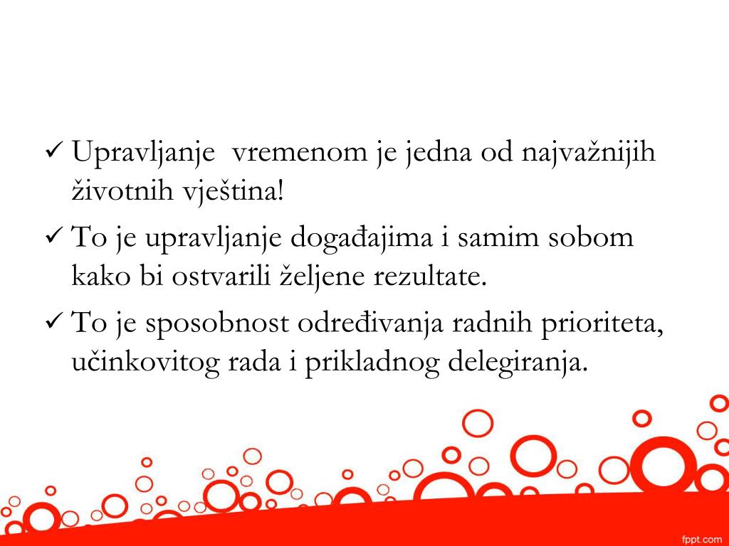 Upravljanje vremenom je jedna od najvažnijih životnih vještina! • To je upravljanje događajima i samim sobom kako bi ostvarili željene rezultate. • To je sposobnost određivanja radnih prioriteta, učinkovitog rada i prikladnog delegiranja.