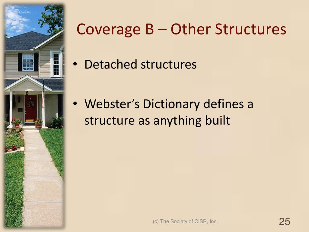 Coverage B – Other Structures • Detached structures • Webster’s Dictionary defines a structure as anything built (c) The Society of CISR, Inc.