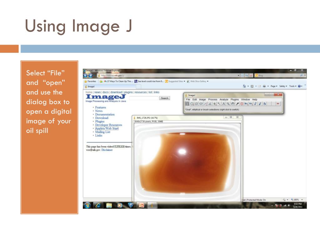 Using Image J Select “File” and “open” and use the dialog box to open a digital image of your oil spill