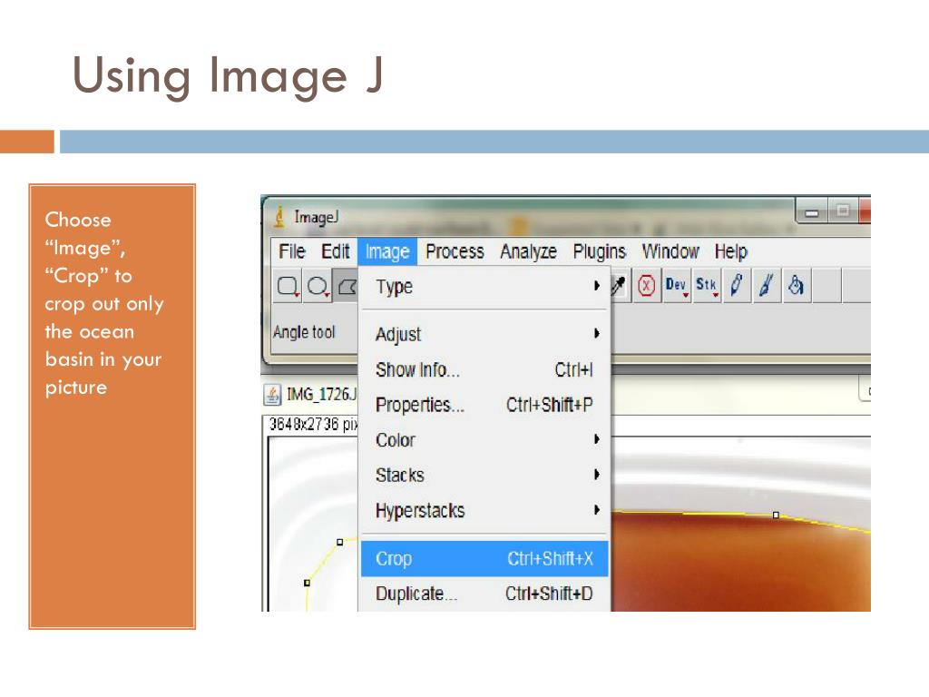 Using Image J Choose “Image”, “Crop” to crop out only the ocean basin in your picture
