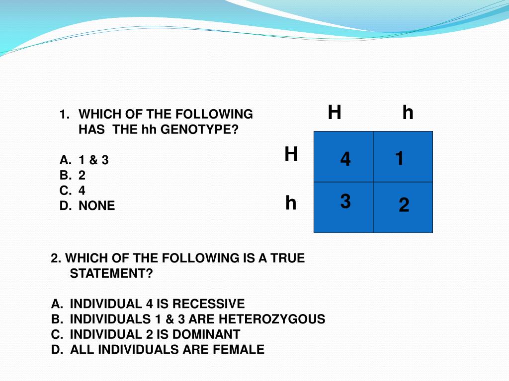 H h • WHICH OF THE FOLLOWING HAS THE hh GENOTYPE? • 1 & 3 • 2 • 4 • NONE H 1 4 3 h 2 • 2. WHICH OF THE FOLLOWING IS A TRUE STATEMENT? • INDIVIDUAL 4 IS RECESSIVE • INDIVIDUALS 1 & 3 ARE HETEROZYGOUS • INDIVIDUAL 2 IS DOMINANT • ALL INDIVIDUALS ARE FEMALE
