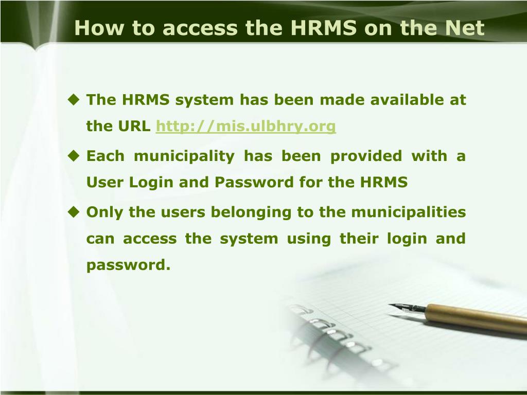 How to access the HRMS on the Net • The HRMS system has been made available at the URL http://mis.ulbhry.org • Each municipality has been provided with a User Login and Password for the HRMS • Only the users belonging to the municipalities can access the system using their login and password.