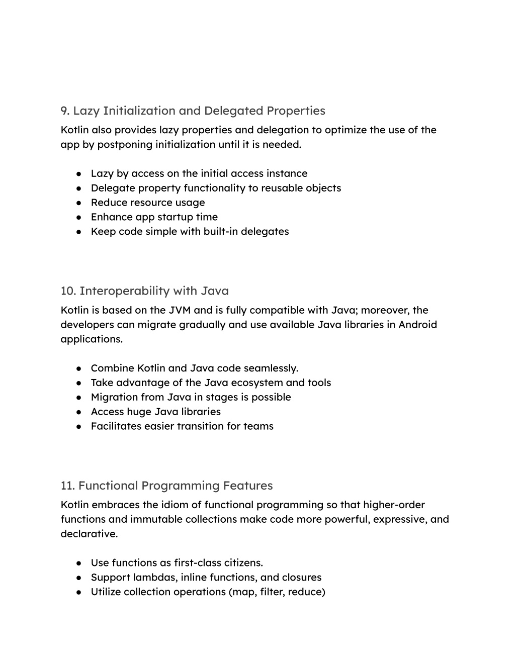 9. Lazy Initialization and Delegated Properties Kotlin also provides lazy properties and delegation to optimize the use of the app by postponing initialization until it is needed. ● Lazy by access on the initial access instance ● Delegate property functionality to reusable objects ● Reduce resource usage ● Enhance app startup time ● Keep code simple with built-in delegates 10. Interoperability with Java Kotlin is based on the JVM and is fully compatible with Java; moreover, the developers can migrate gradually and use available Java libraries in Android applications. ● Combine Kotlin and Java code seamlessly. ● Take advantage of the Java ecosystem and tools ● Migration from Java in stages is possible ● Access huge Java libraries ● Facilitates easier transition for teams 11. Functional Programming Features Kotlin embraces the idiom of functional programming so that higher-order functions and immutable collections make code more powerful, expressive, and declarative. ● Use functions as first-class citizens. ● Support lambdas, inline functions, and closures ● Utilize collection operations (map, filter, reduce)
