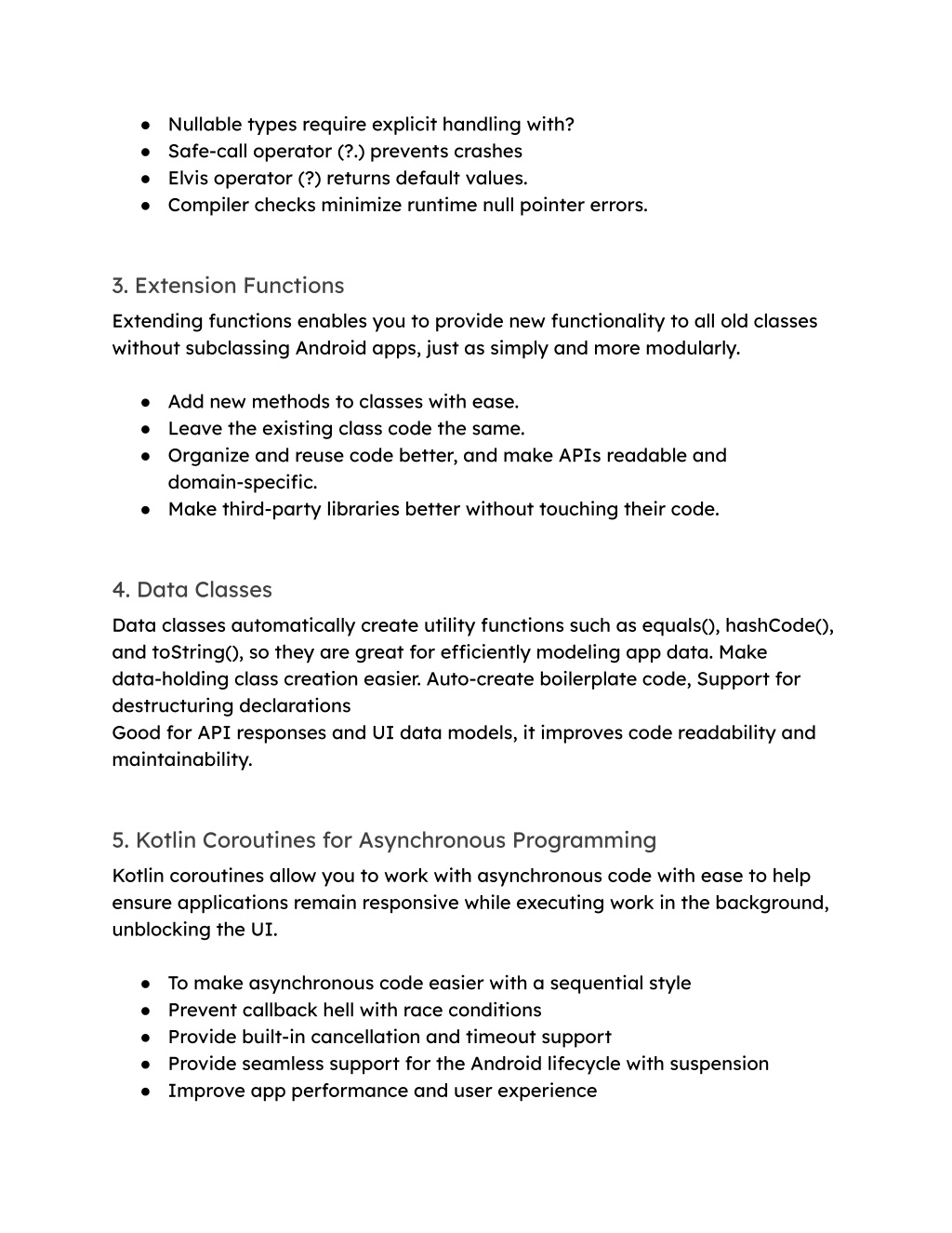 ● Nullable types require explicit handling with? ● Safe-call operator (?.) prevents crashes ● Elvis operator (?) returns default values. ● Compiler checks minimize runtime null pointer errors. 3. Extension Functions Extending functions enables you to provide new functionality to all old classes without subclassing Android apps, just as simply and more modularly. ● Add new methods to classes with ease. ● Leave the existing class code the same. ● Organize and reuse code better, and make APIs readable and domain-specific. ● Make third-party libraries better without touching their code. 4. Data Classes Data classes automatically create utility functions such as equals(), hashCode(), and toString(), so they are great for efficiently modeling app data. Make data-holding class creation easier. Auto-create boilerplate code, Support for destructuring declarations Good for API responses and UI data models, it improves code readability and maintainability. 5. Kotlin Coroutines for Asynchronous Programming Kotlin coroutines allow you to work with asynchronous code with ease to help ensure applications remain responsive while executing work in the background, unblocking the UI. ● To make asynchronous code easier with a sequential style ● Prevent callback hell with race conditions ● Provide built-in cancellation and timeout support ● Provide seamless support for the Android lifecycle with suspension ● Improve app performance and user experience