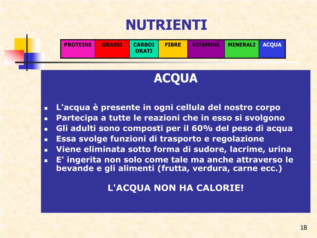 NUTRIENTI ACQUA • L'acqua è presente in ogni cellula del nostro corpo • Partecipa a tutte le reazioni che in esso si svolgono • Gli adulti sono composti per il 60% del peso di acqua • Essa svolge funzioni di trasporto e regolazione • Viene eliminata sotto forma di sudore, lacrime, urina • E' ingerita non solo come tale ma anche attraverso le bevande e gli alimenti (frutta, verdura, carne ecc.) L'ACQUA NON HA CALORIE!