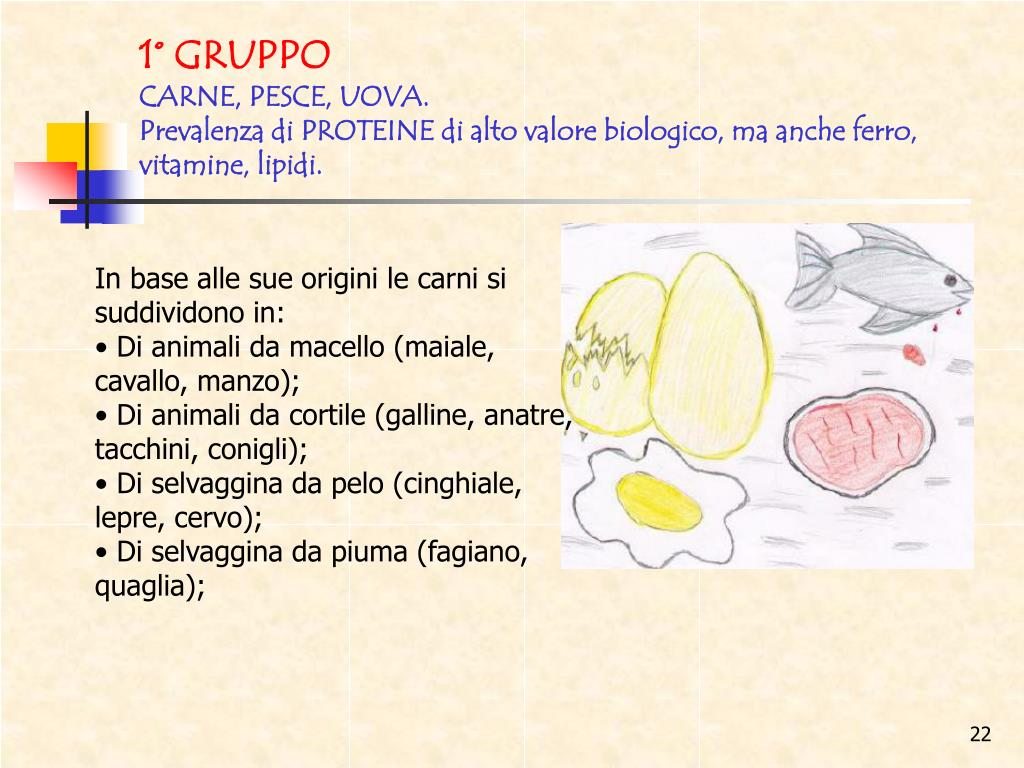 1° GRUPPOCARNE, PESCE, UOVA. Prevalenza di PROTEINE di alto valore biologico, ma anche ferro, vitamine, lipidi. In base alle sue origini le carni si suddividono in: • Di animali da macello (maiale, cavallo, manzo); • Di animali da cortile (galline, anatre, tacchini, conigli); • Di selvaggina da pelo (cinghiale, lepre, cervo); • Di selvaggina da piuma (fagiano, quaglia);