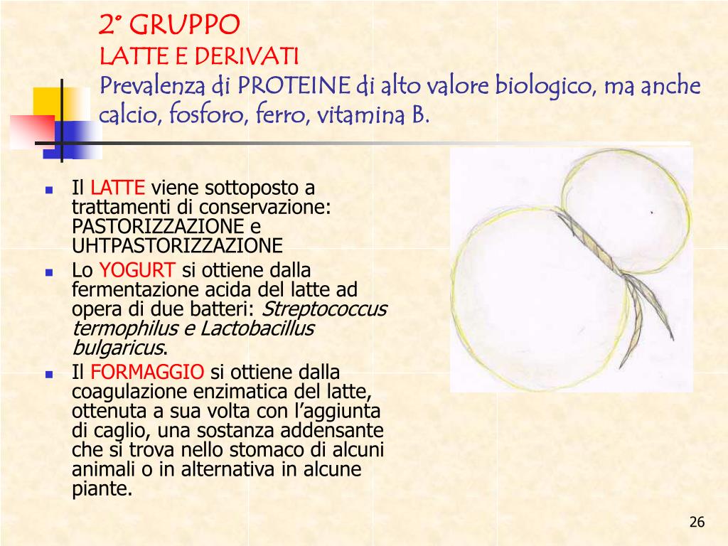 2° GRUPPOLATTE E DERIVATIPrevalenza di PROTEINE di alto valore biologico, ma anche calcio, fosforo, ferro, vitamina B. • Il LATTE viene sottoposto a trattamenti di conservazione: PASTORIZZAZIONE e UHTPASTORIZZAZIONE • Lo YOGURT si ottiene dalla fermentazione acida del latte ad opera di due batteri: Streptococcus termophilus e Lactobacillus bulgaricus. • Il FORMAGGIO si ottiene dalla coagulazione enzimatica del latte, ottenuta a sua volta con l’aggiunta di caglio, una sostanza addensante che si trova nello stomaco di alcuni animali o in alternativa in alcune piante.