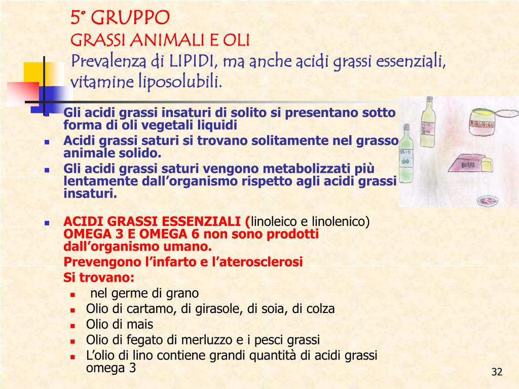 5° GRUPPOGRASSI ANIMALI E OLIPrevalenza di LIPIDI, ma anche acidi grassi essenziali, vitamine liposolubili. • Gli acidi grassi insaturi di solito si presentano sotto forma di oli vegetali liquidi • Acidi grassi saturi si trovano solitamente nel grasso animale solido. • Gli acidi grassi saturi vengono metabolizzati più lentamente dall’organismo rispetto agli acidi grassi insaturi. • ACIDI GRASSI ESSENZIALI (linoleico e linolenico) OMEGA 3 E OMEGA 6 non sono prodotti dall’organismo umano. Prevengono l’infarto e l’aterosclerosi Si trovano: • nel germe di grano • Olio di cartamo, di girasole, di soia, di colza • Olio di mais • Olio di fegato di merluzzo e i pesci grassi • L’olio di lino contiene grandi quantità di acidi grassi omega 3