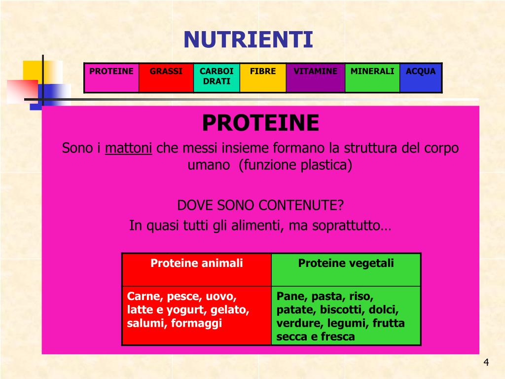 NUTRIENTI PROTEINE Sono i mattoni che messi insieme formano la struttura del corpo umano (funzione plastica) DOVE SONO CONTENUTE? In quasi tutti gli alimenti, ma soprattutto…