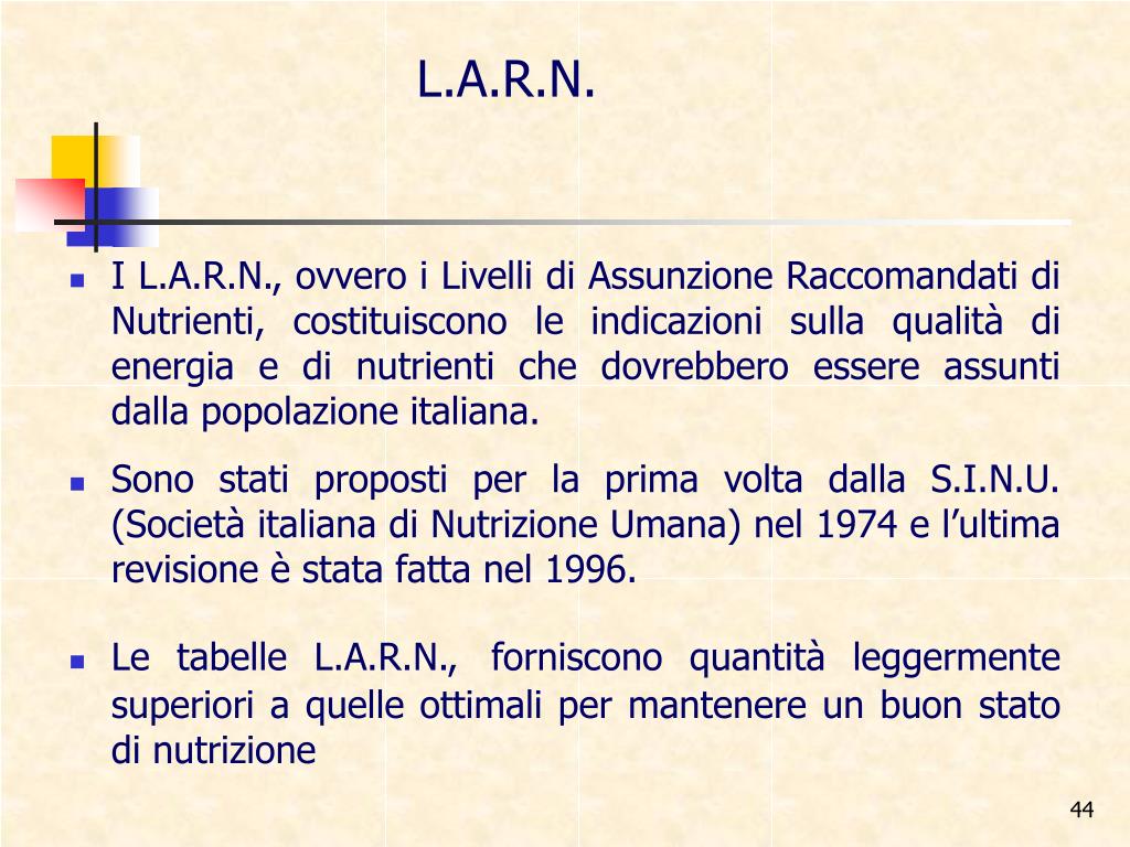 L.A.R.N. I L.A.R.N., ovvero i Livelli di Assunzione Raccomandati di Nutrienti, costituiscono le indicazioni sulla qualità di energia e di nutrienti che dovrebbero essere assunti dalla popolazione italiana. Sono stati proposti per la prima volta dalla S.I.N.U. (Società italiana di Nutrizione Umana) nel 1974 e l’ultima revisione è stata fatta nel 1996. Le tabelle L.A.R.N.,forniscono quantità leggermente superiori a quelle ottimali per mantenere un buon stato di nutrizione