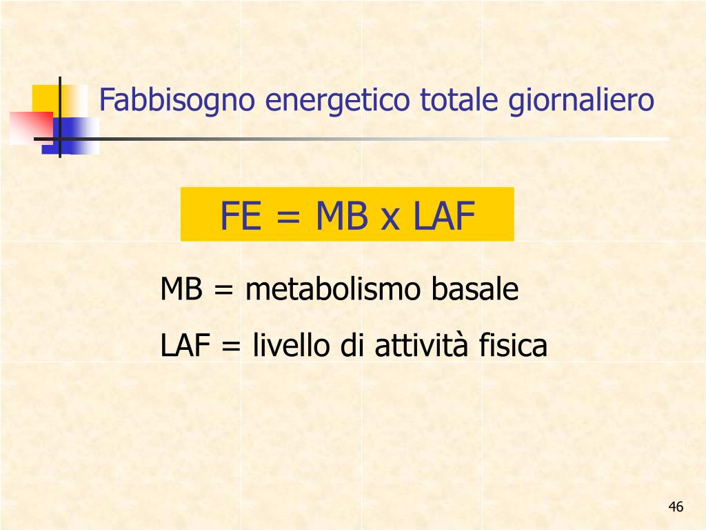 Fabbisogno energetico totale giornaliero FE = MB x LAF MB = metabolismo basale LAF = livello di attività fisica