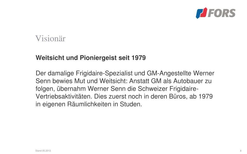 Visionär • Eine enge Partnerschaft zu LIEBHERR entsteht • Werner Senn nutzte geschickt bestehende Beziehungen zu Hans Liebherr: • Dieser stellte für Frigidaire Kühlgeräte her und bekam von Werner Senn die dafür notwendigen Produktionswerkzeuge vom Werk Adam Opel geliefert. Die Marke LIEBHERR ersetzte bei FORS ab 1986 Frigidaire. Dies war die wirtschaftliche Grundlage für die kommenden Jahrzehnte.