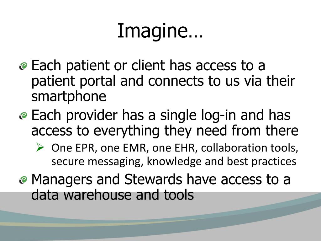 Imagine… • Each patient or client has access to a patient portal and connects to us via their smartphone • Each provider has a single log-in and has access to everything they need from there • One EPR, one EMR, one EHR, collaboration tools, secure messaging, knowledge and best practices • Managers and Stewards have access to a data warehouse and tools