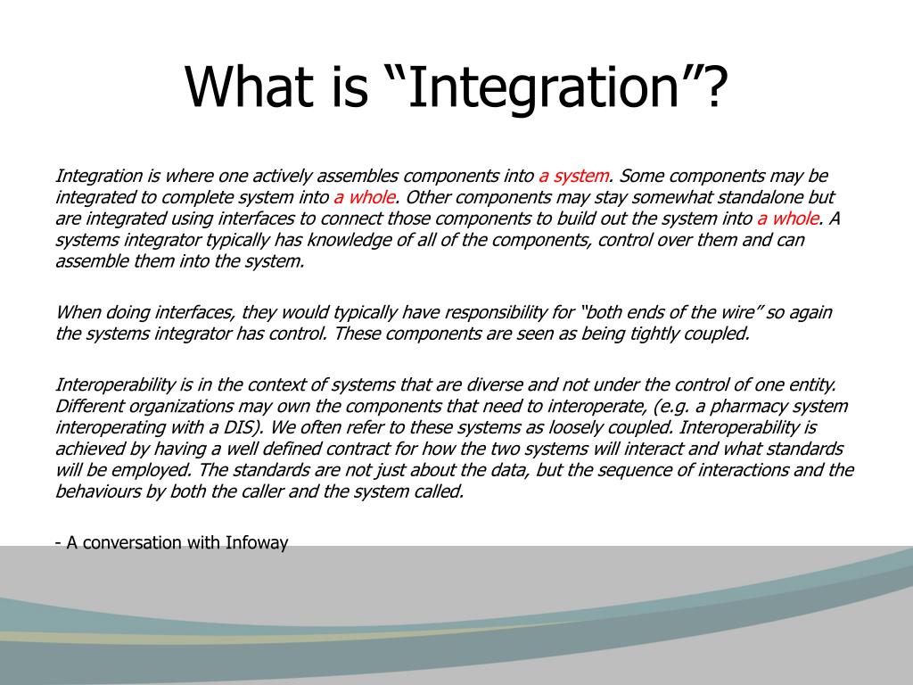 What is “Integration”? Integration is where one actively assembles components into a system. Some components may be integrated to complete system into a whole. Other components may stay somewhat standalone but are integrated using interfaces to connect those components to build out the system into a whole. A systems integrator typically has knowledge of all of the components, control over them and can assemble them into the system. When doing interfaces, they would typically have responsibility for “both ends of the wire” so again the systems integrator has control. These components are seen as being tightly coupled. Interoperability is in the context of systems that are diverse and not under the control of one entity. Different organizations may own the components that need to interoperate, (e.g. a pharmacy system interoperating with a DIS). We often refer to these systems as loosely coupled. Interoperability is achieved by having a well defined contract for how the two systems will interact and what standards will be employed. The standards are not just about the data, but the sequence of interactions and the behaviours by both the caller and the system called. - A conversation with Infoway