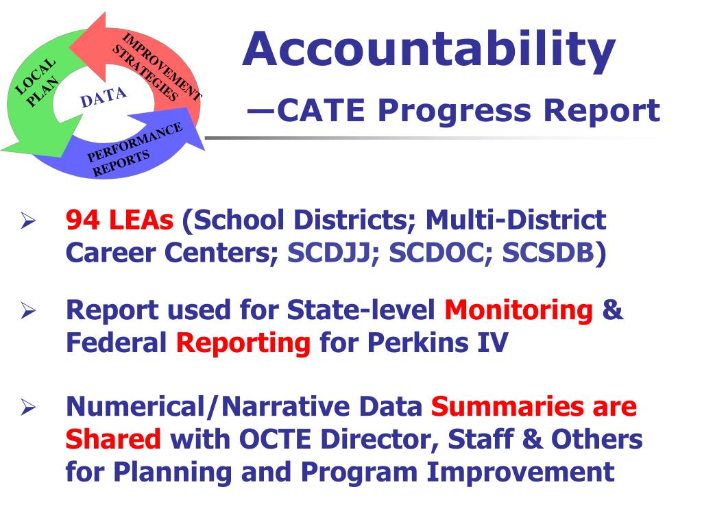Accountability—CATE Progress Report • 94 LEAs (School Districts; Multi-District Career Centers; SCDJJ; SCDOC; SCSDB) • Report used for State-level Monitoring & Federal Reporting for Perkins IV • Numerical/Narrative Data SummariesareShared with OCTE Director, Staff & Others for Planning and Program Improvement