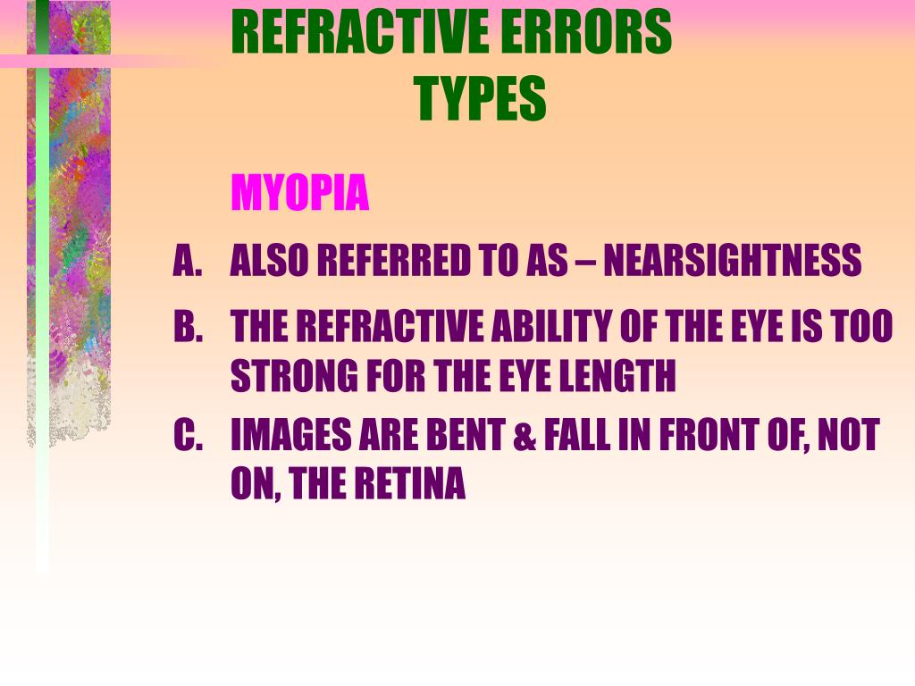 REFRACTIVE ERRORS TYPES MYOPIA A. ALSO REFERRED TO AS – NEARSIGHTNESS B. THE REFRACTIVE ABILITY OF THE EYE IS TOO STRONG FOR THE EYE LENGTH C. IMAGES ARE BENT & FALL IN FRONT OF, NOT ON, THE RETINA