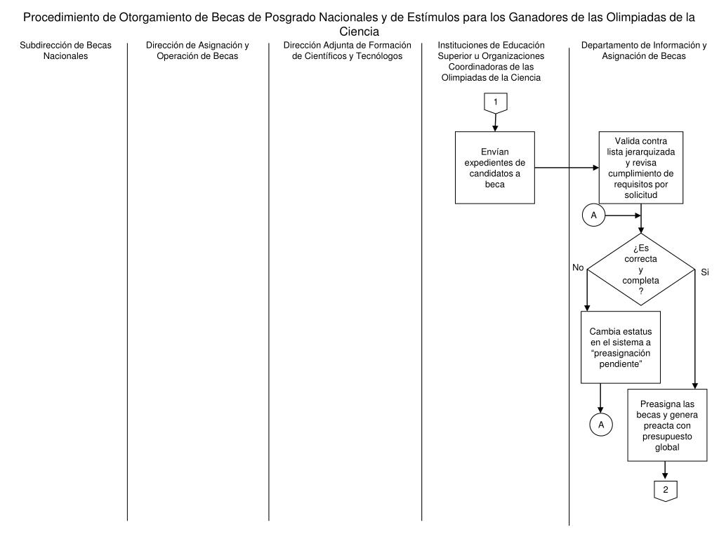 Procedimiento de Otorgamiento de Becas de Posgrado Nacionales y de Estímulos para los Ganadores de las Olimpiadas de la Ciencia Subdirección de Becas Nacionales Dirección de Asignación y Operación de Becas Dirección Adjunta de Formación de Científicos y Tecnólogos Instituciones de Educación Superior u Organizaciones Coordinadoras de las Olimpiadas de la Ciencia Departamento de Información y Asignación de Becas 2 Valida la preasignación A ¿Es correcta? No Si Corrige Recibe preactas y genera escenarios de acuerdo a la disponibilidad presupuestal A Define el número de becas a otorgar Realiza ajustes de acuerdo a la disponibilidad Asigna becas 3