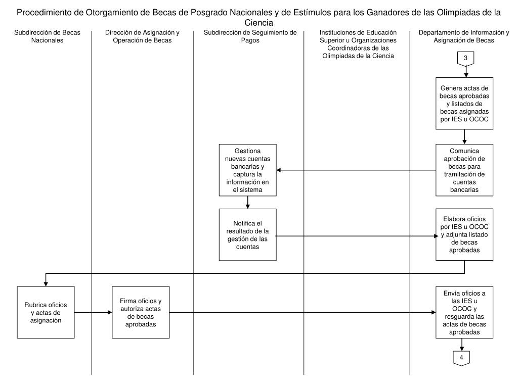 Procedimiento de Otorgamiento de Becas de Posgrado Nacionales y de Estímulos para los Ganadores de las Olimpiadas de la Ciencia Subdirección de Becas Nacionales Dirección de Asignación y Operación de Becas Subdirección de Seguimiento de Pagos Instituciones de Educación Superior u Organizaciones Coordinadoras de las Olimpiadas de la Ciencia Departamento de Información y Asignación de Becas 3 Genera actas de becas aprobadas y listados de becas asignadas por IES u OCOC Gestiona nuevas cuentas bancarias y captura la información en el sistema Comunica aprobación de becas para tramitación de cuentas bancarias Elabora oficios por IES u OCOC y adjunta listado de becas aprobadas Notifica el resultado de la gestión de las cuentas Rubrica oficios y actas de asignación Firma oficios y autoriza actas de becas aprobadas Envía oficios a las IES u OCOC y resguarda las actas de becas aprobadas 4