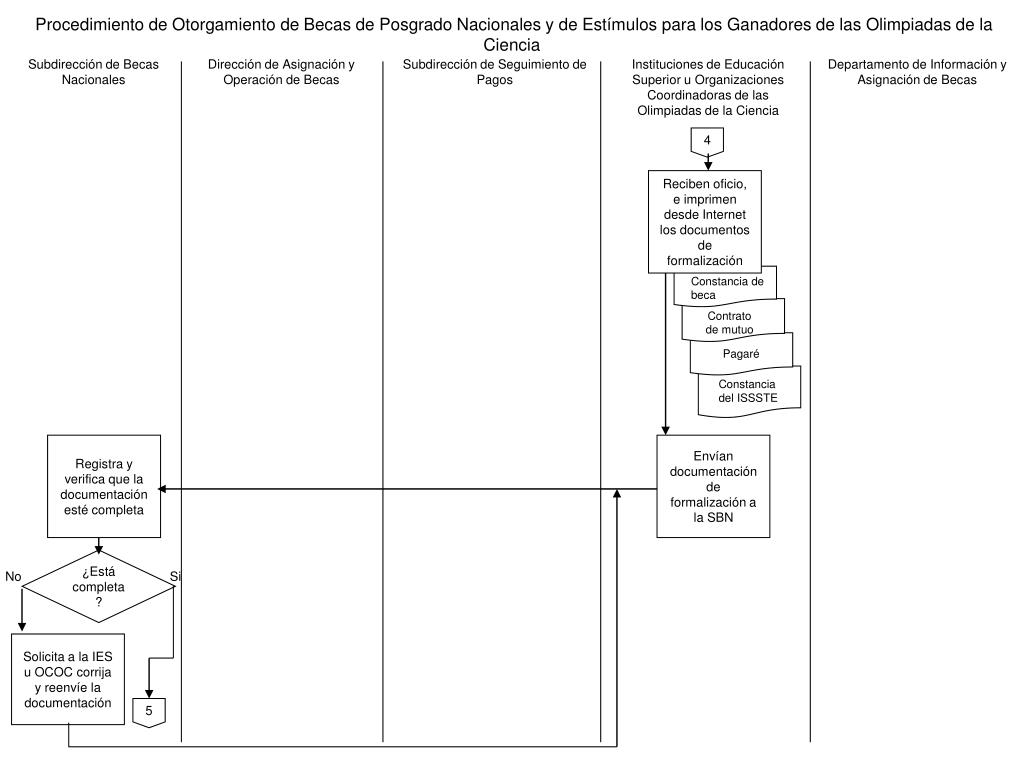 Procedimiento de Otorgamiento de Becas de Posgrado Nacionales y de Estímulos para los Ganadores de las Olimpiadas de la Ciencia Subdirección de Becas Nacionales Dirección de Asignación y Operación de Becas Subdirección de Seguimiento de Pagos Instituciones de Educación Superior u Organizaciones Coordinadoras de las Olimpiadas de la Ciencia Departamento de Información y Asignación de Becas 4 Reciben oficio, e imprimen desde Internet los documentos de formalización Constancia de beca Contrato de mutuo Pagaré Constancia del ISSSTE Registra y verifica que la documentación esté completa Envían documentación de formalización a la SBN ¿Está completa? No Si Solicita a la IES u OCOC corrija y reenvíe la documentación 5
