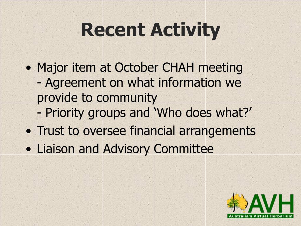 Recent Activity • Major item at October CHAH meeting- Agreement on what information we provide to community - Priority groups and ‘Who does what?’ • Trust to oversee financial arrangements • Liaison and Advisory Committee