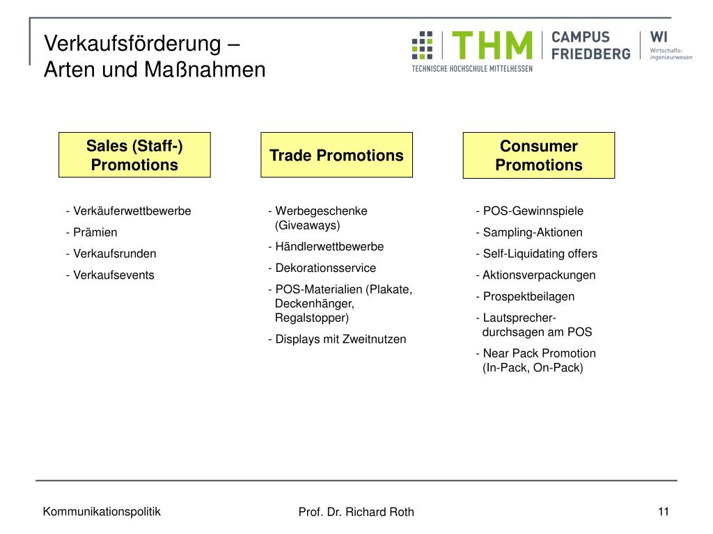 Verkaufsförderung – Arten und Maßnahmen Sales (Staff-) Promotions Trade Promotions Consumer Promotions • Verkäuferwettbewerbe • Prämien • Verkaufsrunden • Verkaufsevents • Werbegeschenke (Giveaways) • Händlerwettbewerbe • Dekorationsservice • POS-Materialien (Plakate, Deckenhänger, Regalstopper) • Displays mit Zweitnutzen • POS-Gewinnspiele • Sampling-Aktionen • Self-Liquidating offers • Aktionsverpackungen • Prospektbeilagen • Lautsprecher- durchsagen am POS • Near Pack Promotion (In-Pack, On-Pack) Prof. Dr. Richard Roth