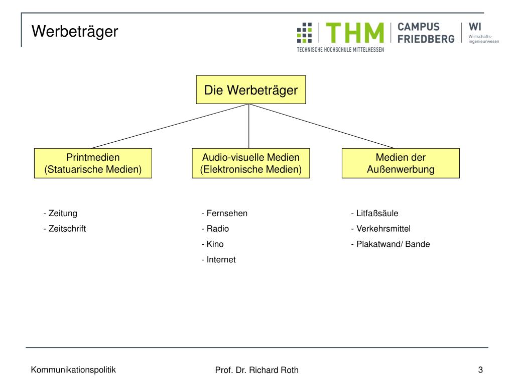 Werbeträger Die Werbeträger Printmedien (Statuarische Medien) Audio-visuelle Medien (Elektronische Medien) Medien der Außenwerbung • Zeitung • Zeitschrift • Fernsehen • Radio • Kino • Internet • Litfaßsäule • Verkehrsmittel • Plakatwand/ Bande Prof. Dr. Richard Roth
