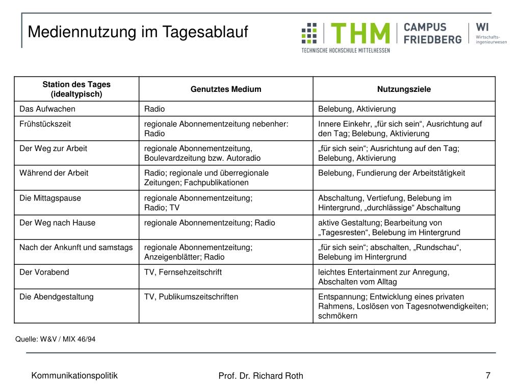 Mediennutzung im Tagesablauf Quelle: W&V / MIX 46/94 Prof. Dr. Richard Roth