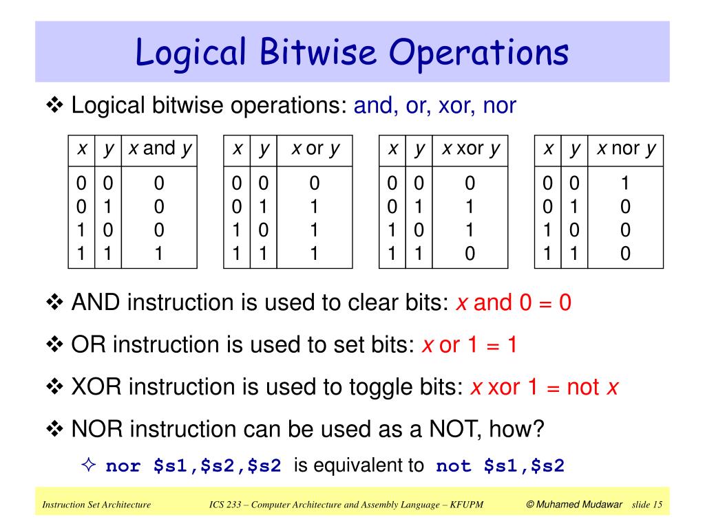 Logical Bitwise Instructions • Examples: Assume $s1 =0xabcd1234 and $s2 =0xffff0000 and $s0,$s1,$s2 # $s0 = 0xabcd0000 or $s0,$s1,$s2 # $s0 = 0xffff1234 xor $s0,$s1,$s2 # $s0 = 0x54321234 nor $s0,$s1,$s2 # $s0 = 0x0000edcb