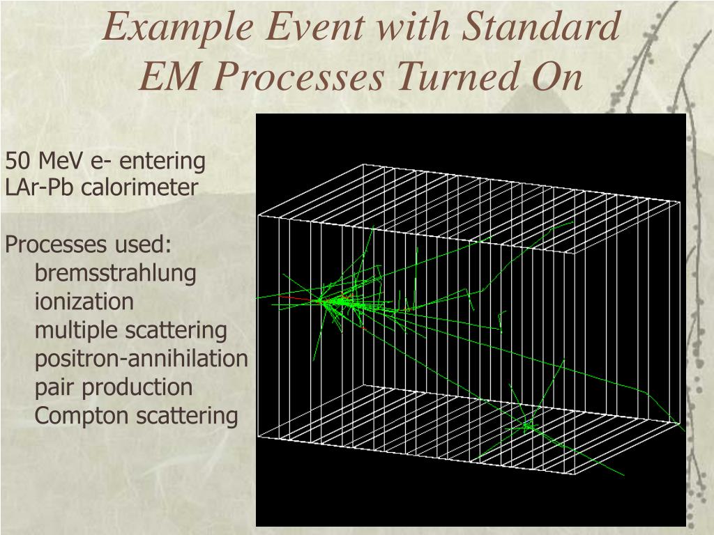 Example Event with Standard EM Processes Turned On 50 MeV e- entering LAr-Pb calorimeter Processes used: bremsstrahlung ionization multiple scattering positron-annihilation pair production Compton scattering