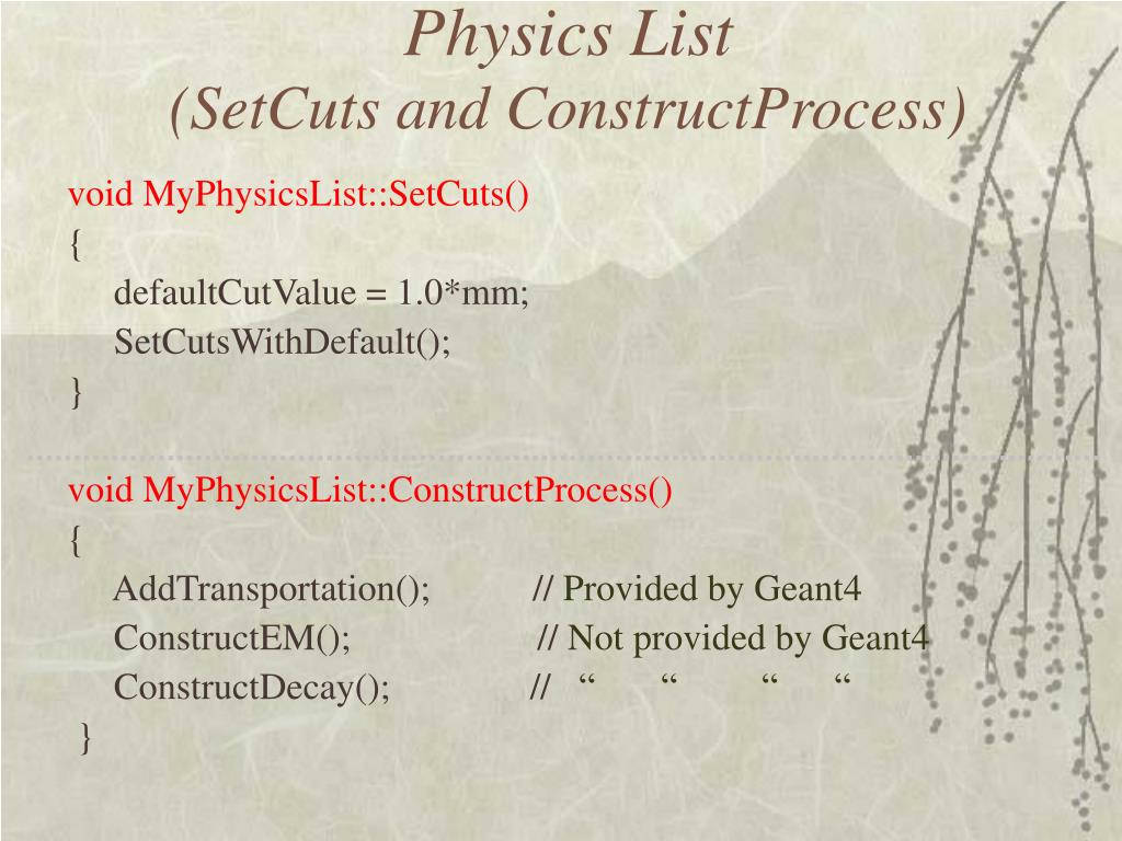 Physics List (SetCuts and ConstructProcess) voidMyPhysicsList::SetCuts() { defaultCutValue = 1.0*mm; SetCutsWithDefault(); } voidMyPhysicsList::ConstructProcess() { AddTransportation(); // Provided by Geant4 ConstructEM(); // Not provided by Geant4 ConstructDecay(); // “ “ “ “ }