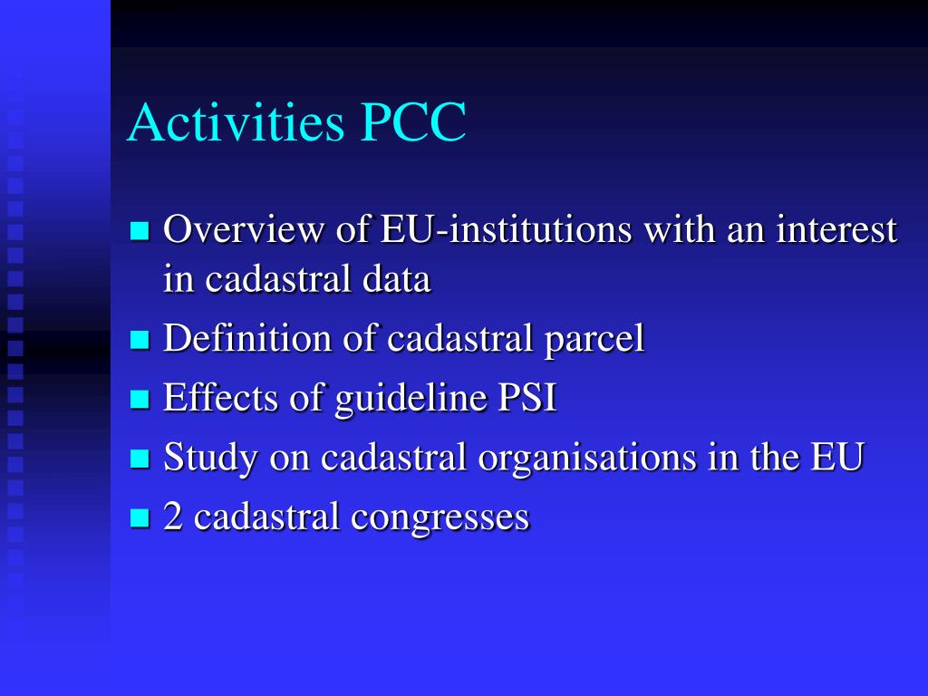 Activities PCC • Overview of EU-institutions with an interest in cadastral data • Definition of cadastral parcel • Effects of guideline PSI • Study on cadastral organisations in the EU • 2 cadastral congresses