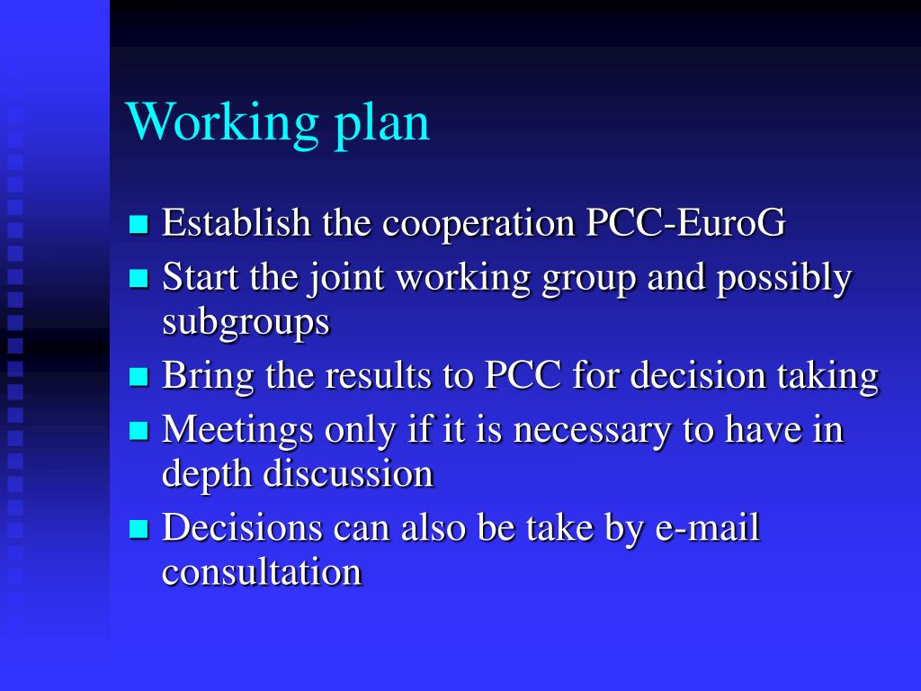 Working plan • Establish the cooperation PCC-EuroG • Start the joint working group and possibly subgroups • Bring the results to PCC for decision taking • Meetings only if it is necessary to have in depth discussion • Decisions can also be take by e-mail consultation