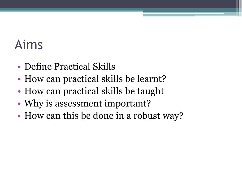 Aims • Define Practical Skills • How can practical skills be learnt? • How can practical skills be taught • Why is assessment important? • How can this be done in a robust way?